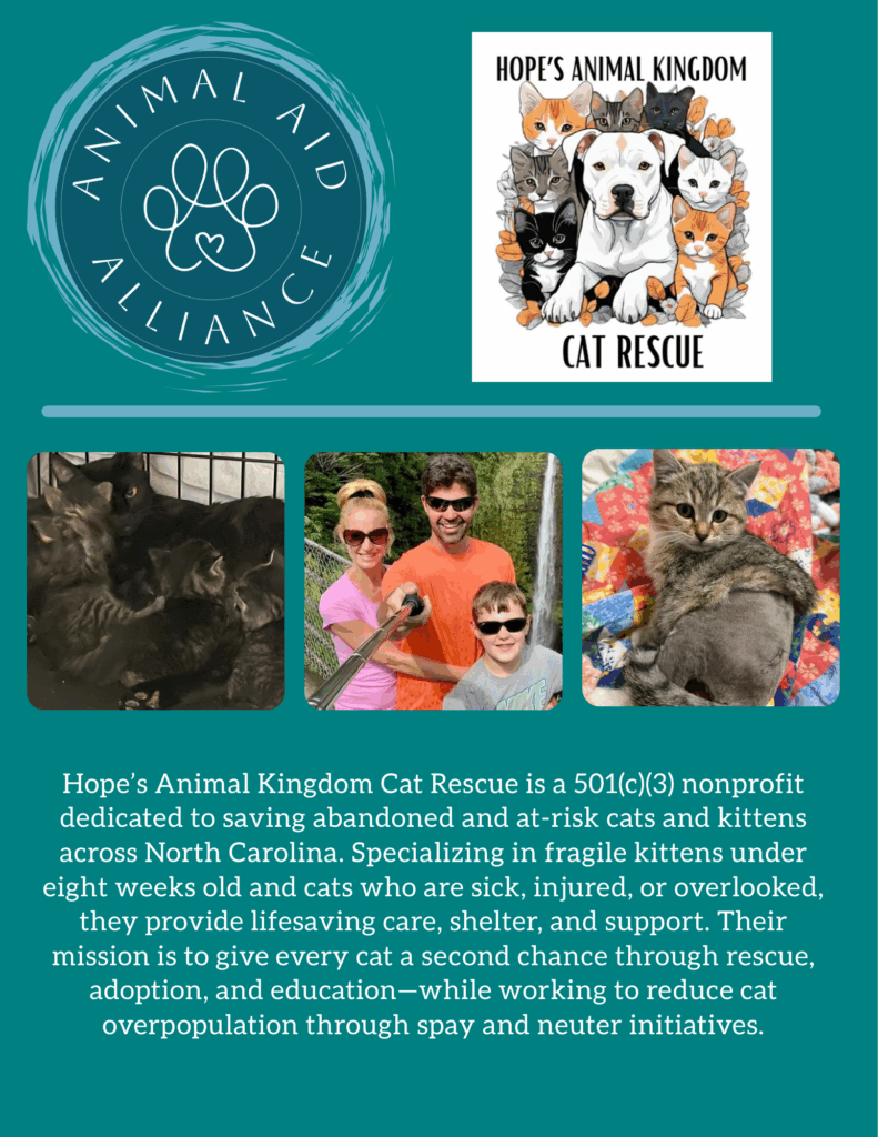 They are dedicated to saving the lives of abandoned and homeless cats and kittens in NC. Their mission is to give the most fragile and vulnerable cats a fighting chance at life. They specialize in rescuing kittens less than 8 weeks old, as well as those who are sick, injured, or otherwise at risk of being overlooked.