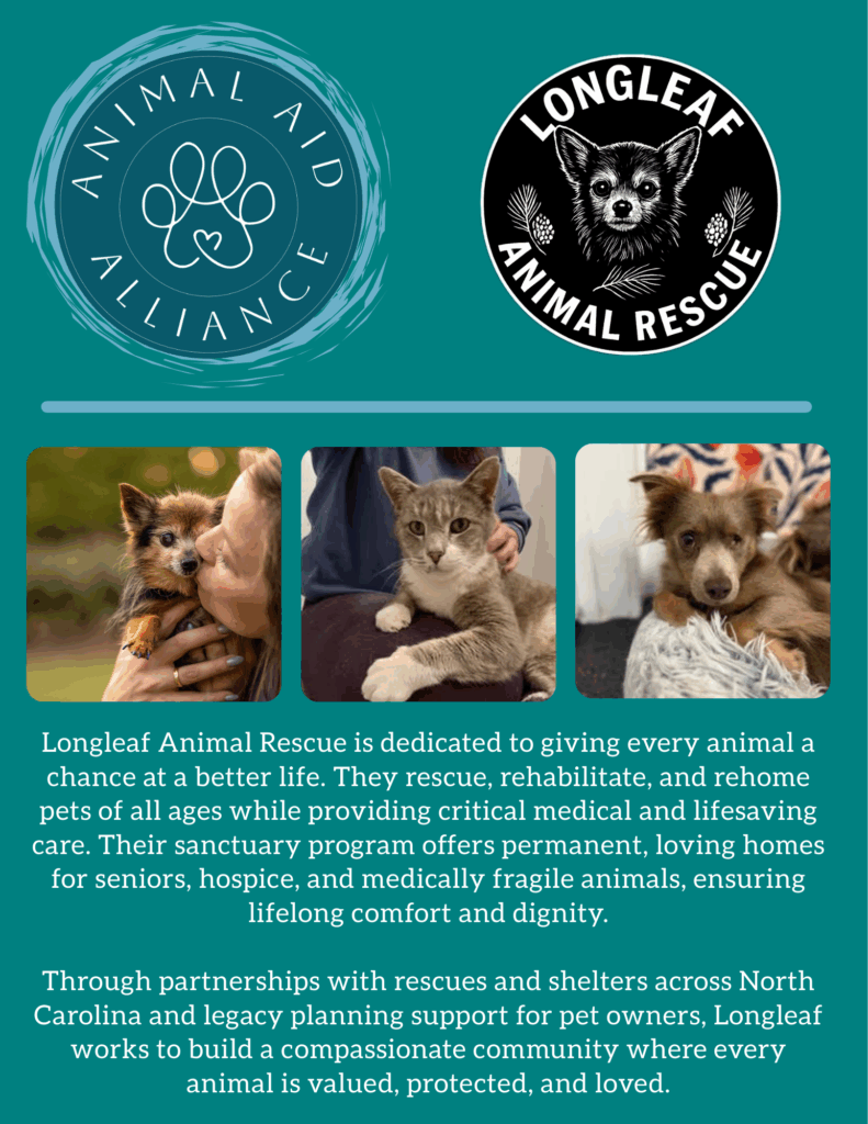 Longleaf Animal Rescue is dedicated to giving every animal a chance at a better life. They rescue, rehabilitate, and rehome pets of all ages while providing critical medical and lifesaving care. Their sanctuary program offers permanent, loving homes for seniors, hospice, and medically fragile animals.