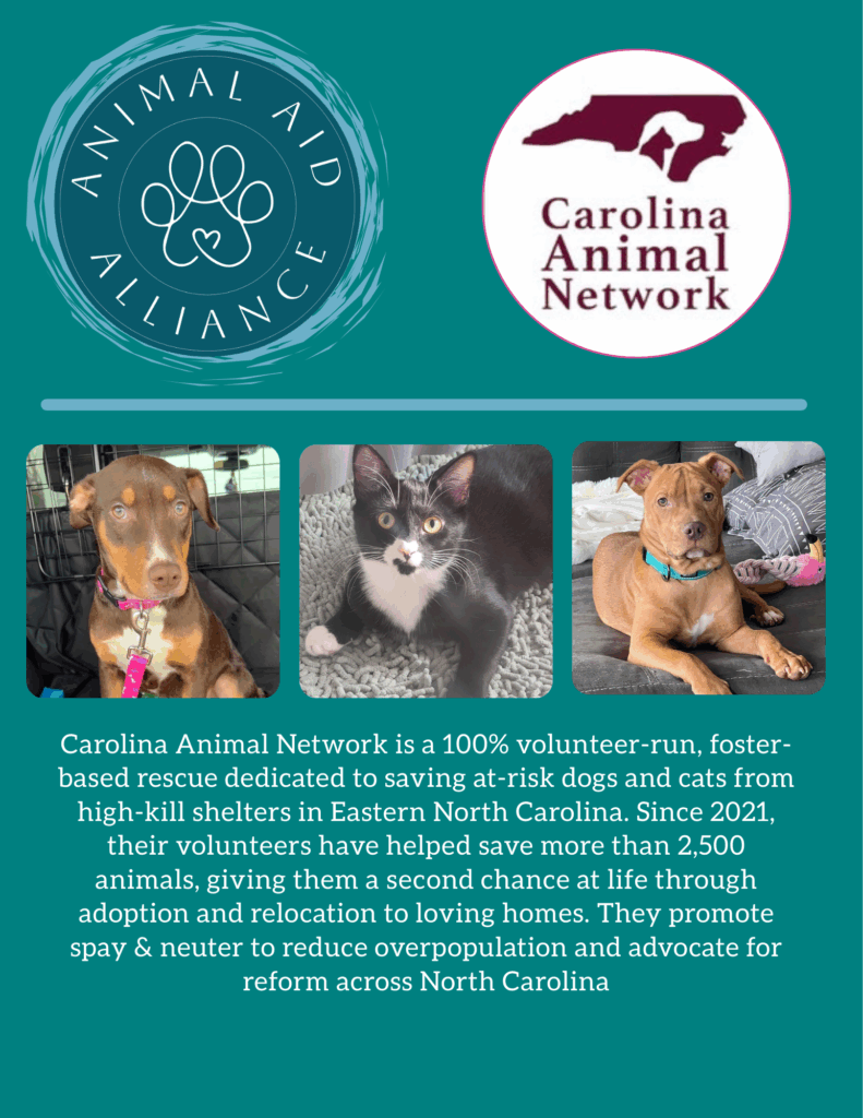Carolina Animal Network is a 100% volunteer-run, foster-based rescue dedicated to saving at-risk dogs and cats from high-kill shelters in Eastern North Carolina. Since 2021, their volunteers have helped save more than 2,500 animals, giving them a second chance at life through adoption and relocation to loving homes. They promote spay & neuter to reduce overpopulation and advocate for reform across North Carolina